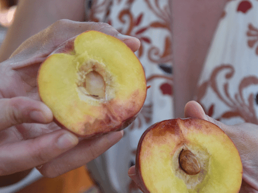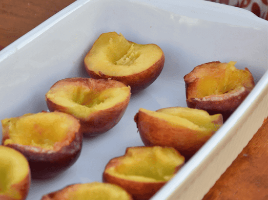Κόβουμε προσεκτικά τα ροδάκινα στη μέση και πετάμε τα κουκούτσια.