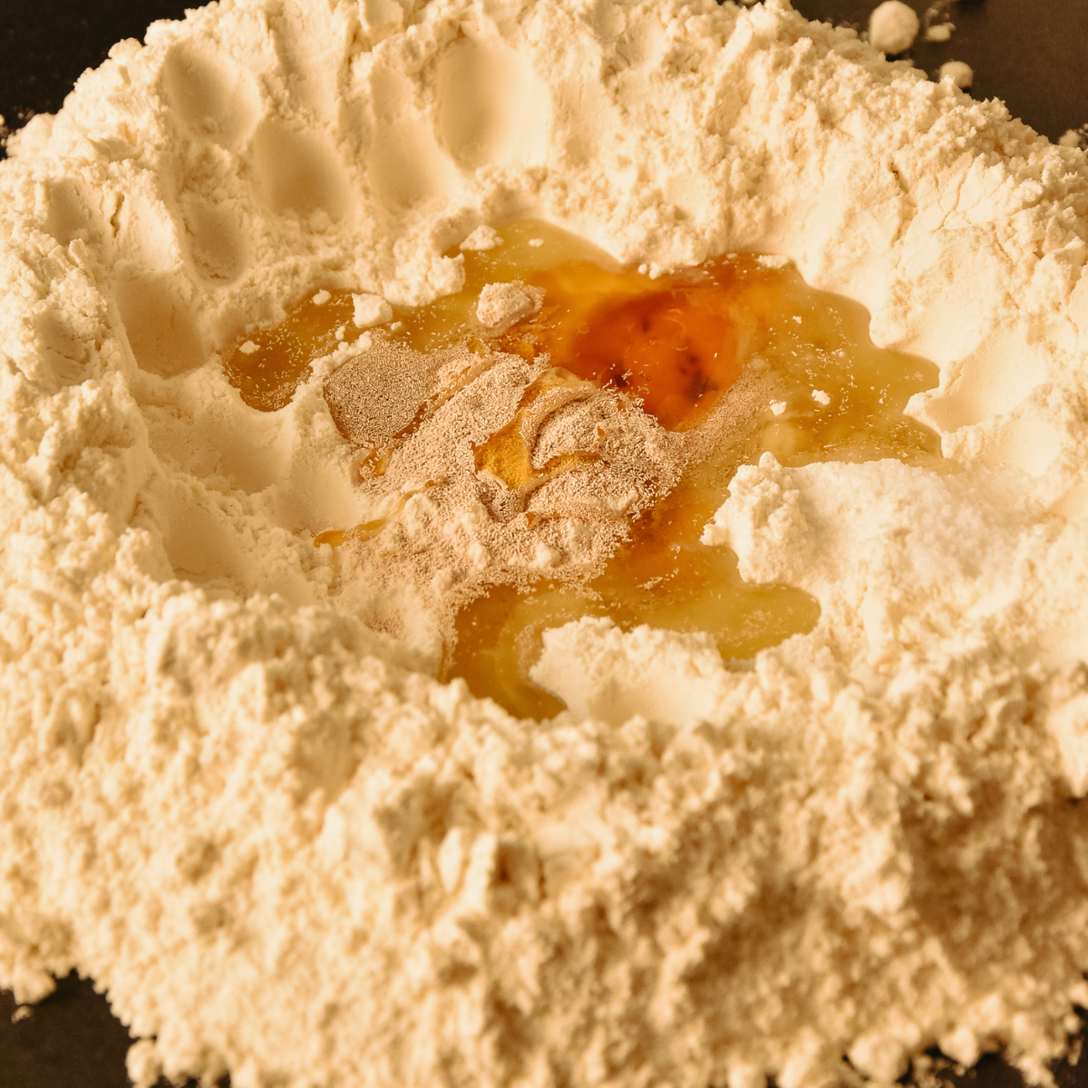 Σε ένα μπολ βάζουμε μέσα το νερό, την μαγιά, το μέλι και το ελαιόλαδο.