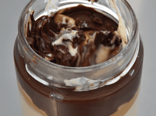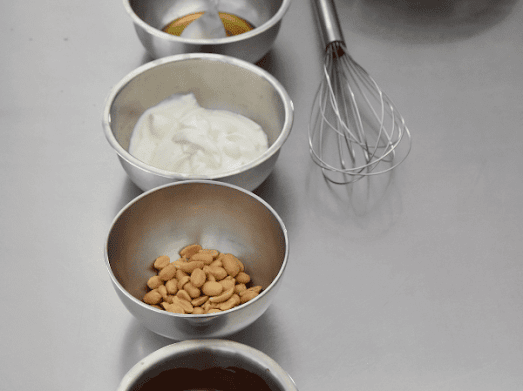 Ρίχνουμε το φυστικοβούτυρο, έπειτα τα φυστίκια και τέλος την λιωμένη κουβερτούρα.